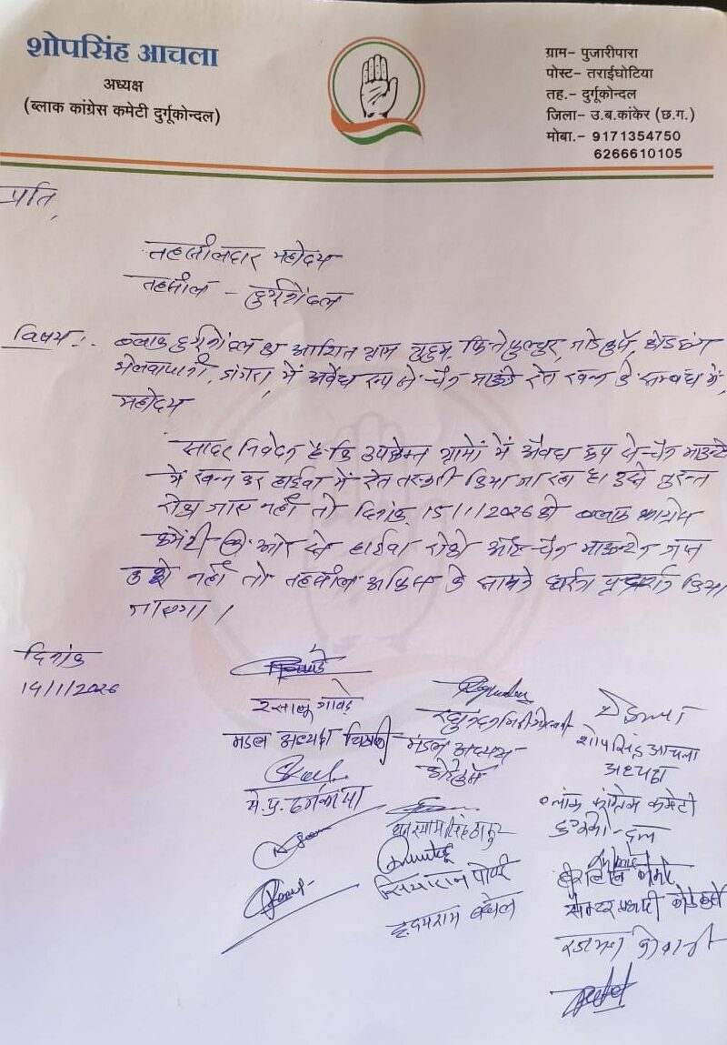 कांकेर:- दूर्गुकोंदल क्षेत्र में बढ़ते अवैध रेत उत्खनन को लेकर स्थानीय जनप्रतिनिधियों और ब्लॉक कांग्रेस कमेटी ने कड़ा रुख अपनाया है। आज ब्लॉक कांग्रेस कमेटी के अध्यक्ष शोपसिंह आचला के नेतृत्व में तहसीलदार को एक ज्ञापन सौंपकर क्षेत्र के विभिन्न गांवों में चल रहे अवैध चैन माउंटेन और रेत तस्करी को तत्काल रोकने की मांग की गई है। प्रमुख बिंदु: “नहीं रुकी तस्करी, तो होगा धरना प्रदर्शन”ज्ञापन में चेतावनी दी गई है कि यदि शासन-प्रशासन चैन माउंटेन मशीनों को जब्त नहीं करता और रेत तस्करी पर लगाम नहीं लगाता, तो…