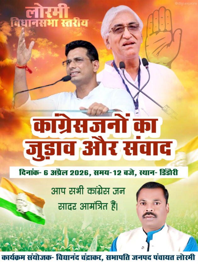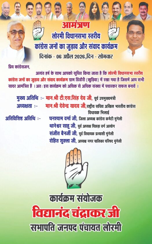 लोरमी। छत्तीसगढ़ के मुंगेली जिले के अंतर्गत आने वाले लोरमी विधानसभा क्षेत्र में कांग्रेस पार्टी अपनी जड़ों को मजबूत करने और कार्यकर्ताओं में नई ऊर्जा फूंकने के लिए एक बड़े संवाद कार्यक्रम का आयोजन करने जा रही है। ‘कांग्रेसजनों का जुड़ाव और संवाद’ नाम से आयोजित होने वाला यह कार्यक्रम कल, 6 अप्रैल 2026 को दोपहर 12 बजे डिंडौरी में आयोजित किया जाएगा। इस महत्वपूर्ण आयोजन में प्रदेश के पूर्व उपमुख्यमंत्री टीएस सिंहदेव और भारतीय राष्ट्रीय कांग्रेस के राष्ट्रीय सचिव व भिलाई नगर विधायक देवेंद्र यादव विशेष रूप से उपस्थित रहेंगे।